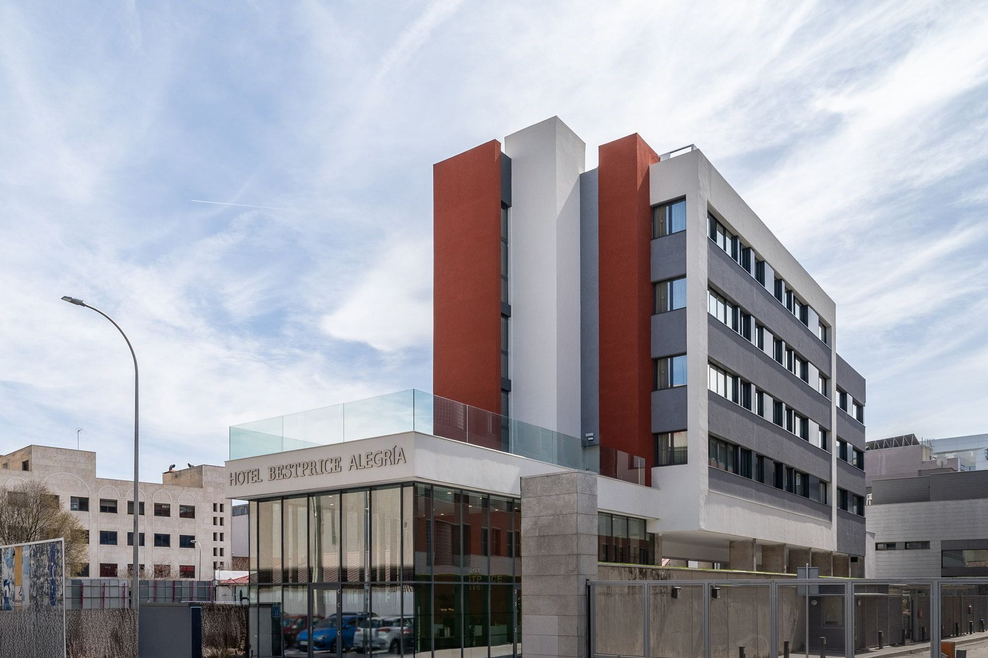 Bestprice Alegría has 53 rooms spread over a built area of approximately 1,870 square metres. It features a contemporary and functional design, with a double-height glass-walled lobby that opens onto a landscaped area, providing a sense of integration with nature. It also has a spacious chill-out terrace on the first floor, ideal for relaxing and enjoying the views of the city.