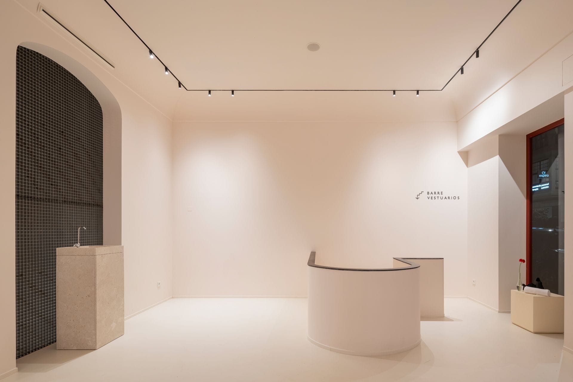 The original premises, covering more than 300 m2, required two specific interventions to adapt it to its new use. On the one hand, the exercise rooms were soundproofed with a double acoustic ceiling consisting of a floating system of plasterboard and high-density rock wool. On the other hand, the façade had to be restored to its original state, as it is listed as a protected heritage site. To this end, a replica was made on site using artificial terrazzo stone, black-coloured mortar and polished marble aggregate. The exterior carpentry is made of iroko wood lacquered in a burgundy tone.