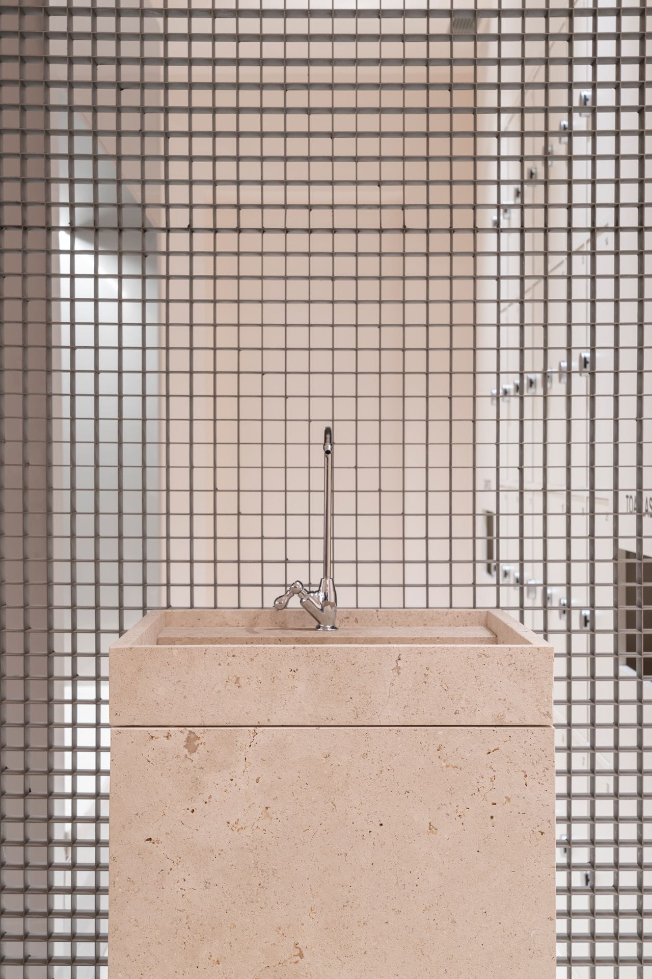 In the spacious, open-plan entrance area, which serves as the reception, there are three arched openings made of plasterboard, into which a metal mesh panel has been integrated as a decorative element, partially concealing the cloakroom and shoe storage area. A wave-shaped wall, built on site, hints at the descent to the basement; a fountain clad in exclusive Campaspero limestone; and the black varnished iron counter are other distinctive features of this room.