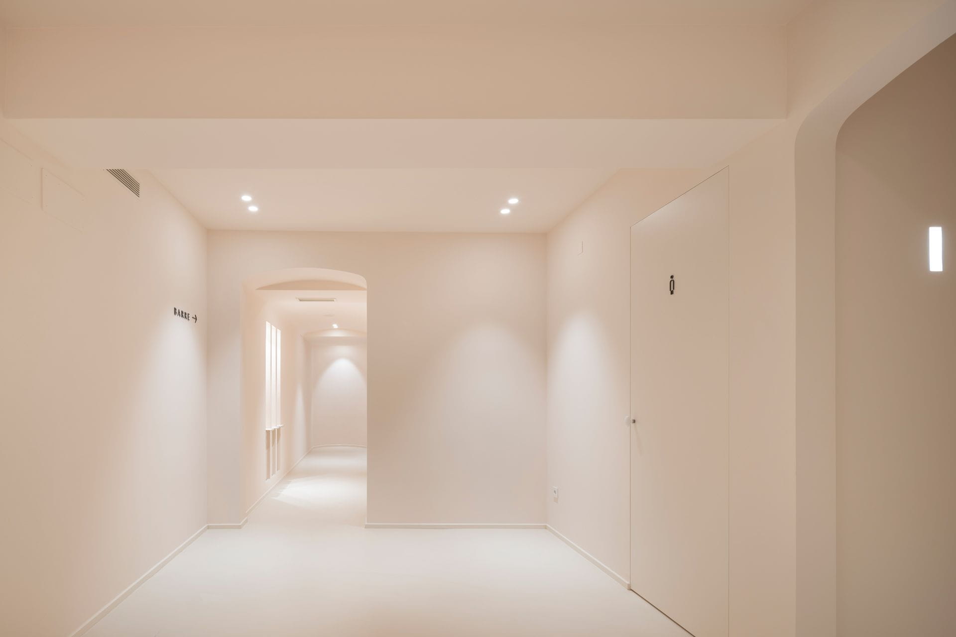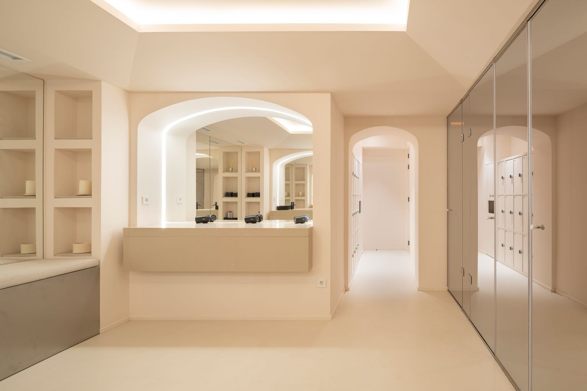 The basement houses the Barre room, with natural oak laminate flooring and two storage areas with backlit shelves. It also houses the changing rooms, with several consecutive shower cubicles clad in ochre ceramic tiles and mirrored doors on the outside. The women's changing area has two pieces of furniture made of compact marble with mitred pieces. The washbasin area has a single large basin with three taps and, in twin form, a dressing table area with a countertop made of the same material. At the front, mirrors framed with a plasterboard arch feature indirect lighting using flexible LED strips.