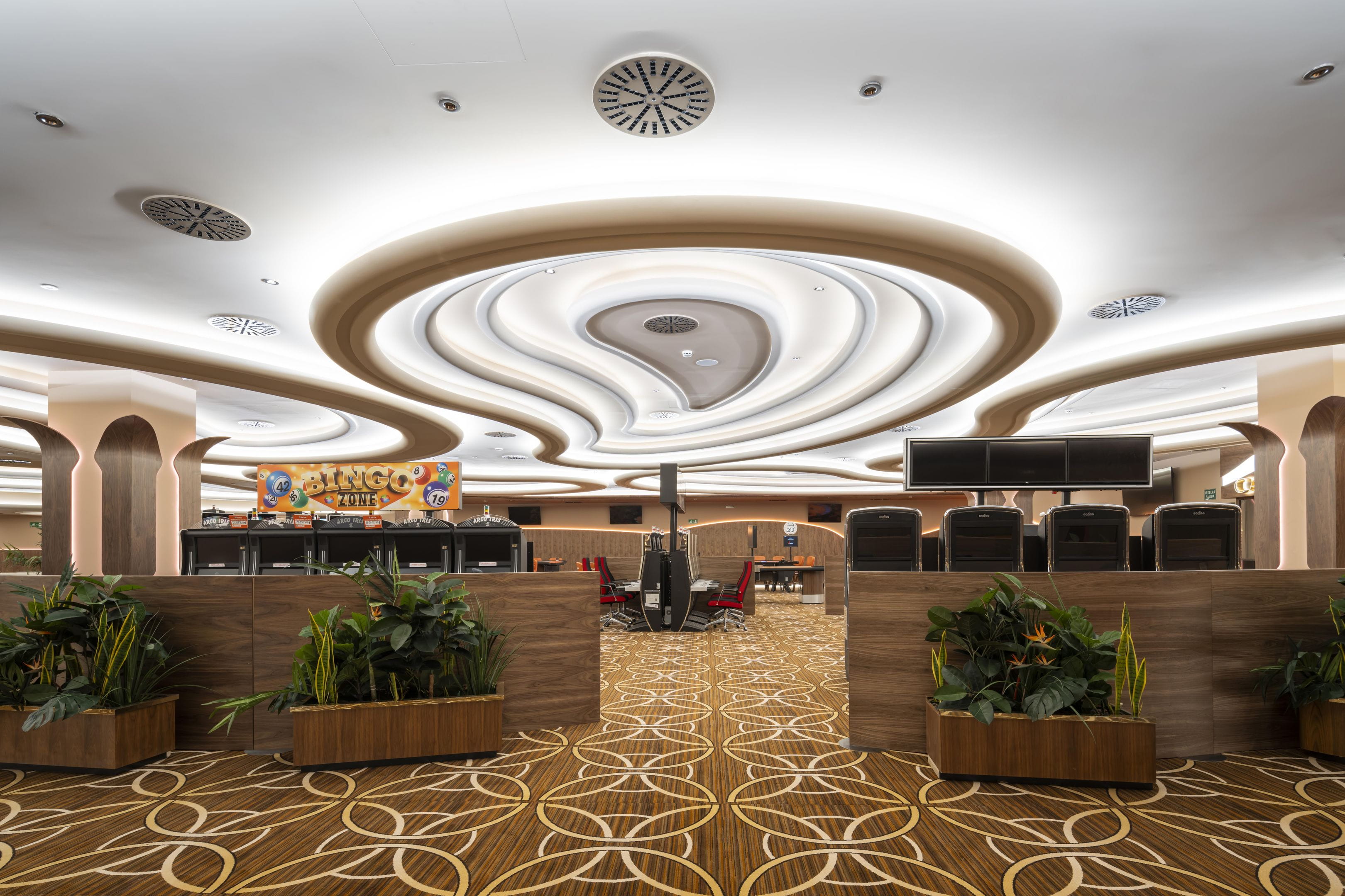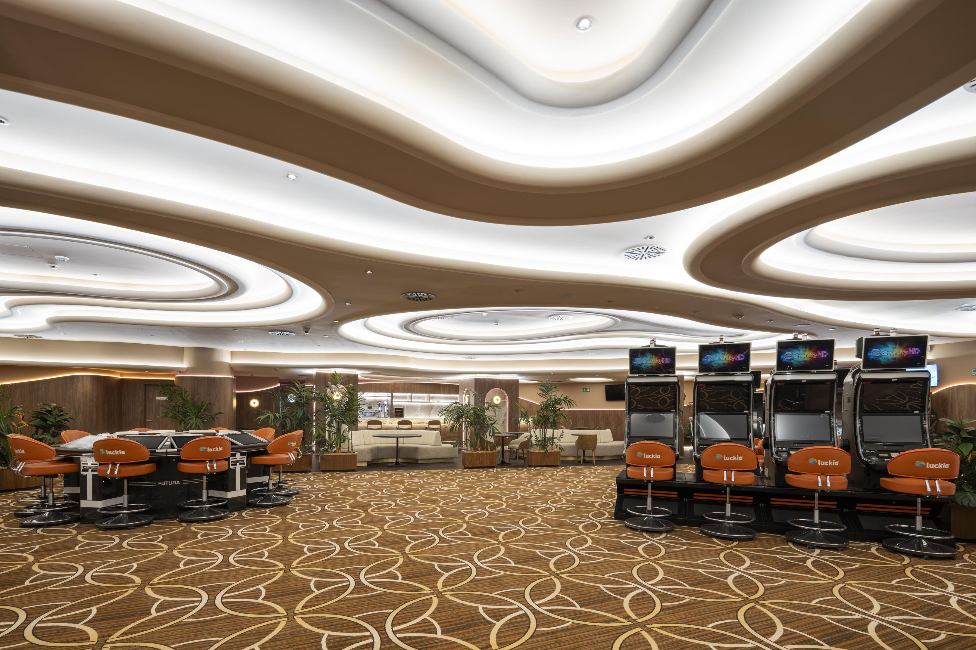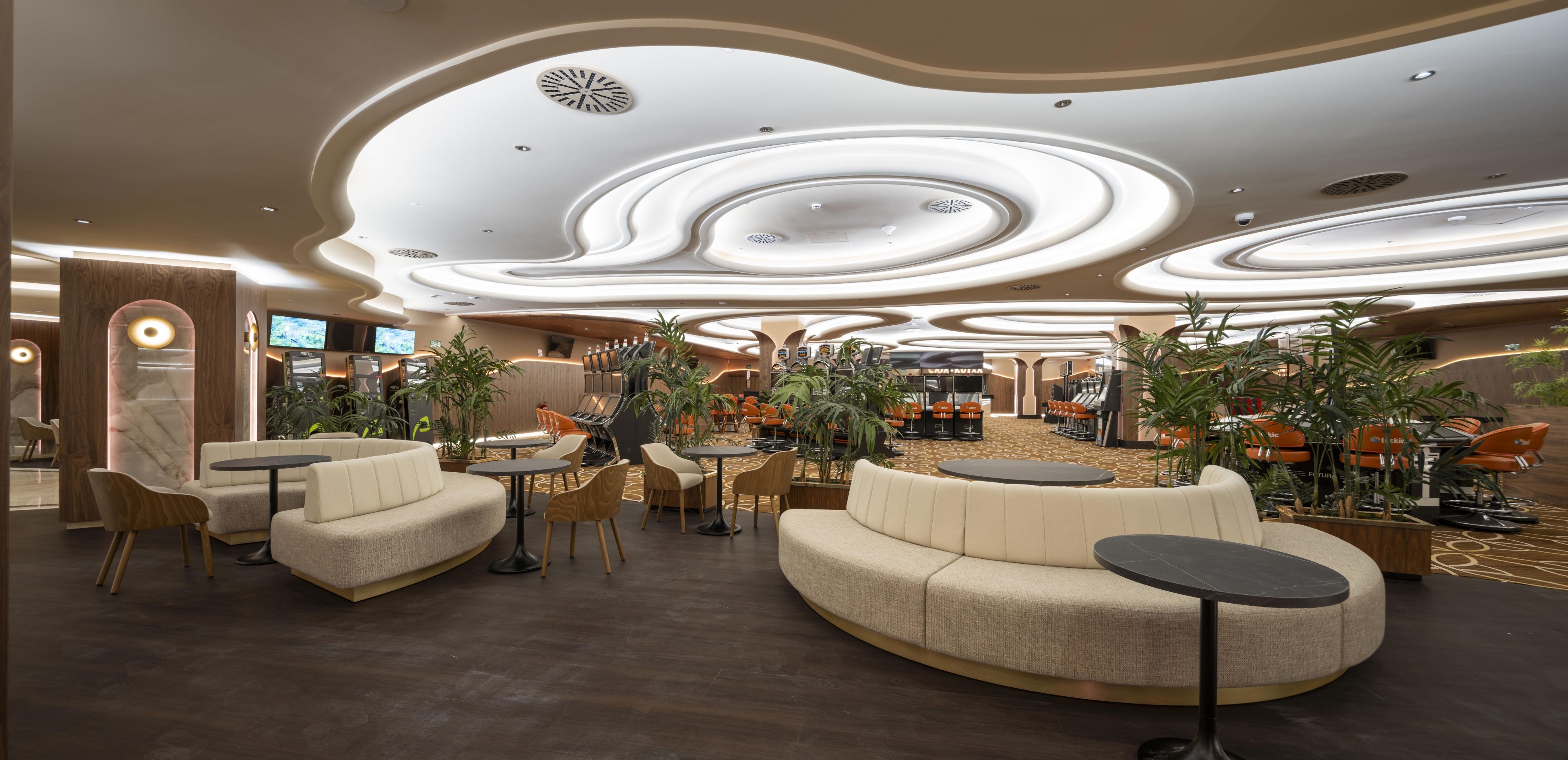 With more than 2,000 m2, this new venue, which has a basement, mezzanine and ground floor that houses its entire gaming offering, features contemporary and exclusive interior design. Among its unique finishes, the wall coverings stand out, with authentic walnut panelling; the countertops in the bar and reception areas, made from the famous polished Italian Calacatta marble to adopt its curved shape; as well as the original kidney-shaped mouldings that surround the light fixtures and turn them into unique decorative elements.