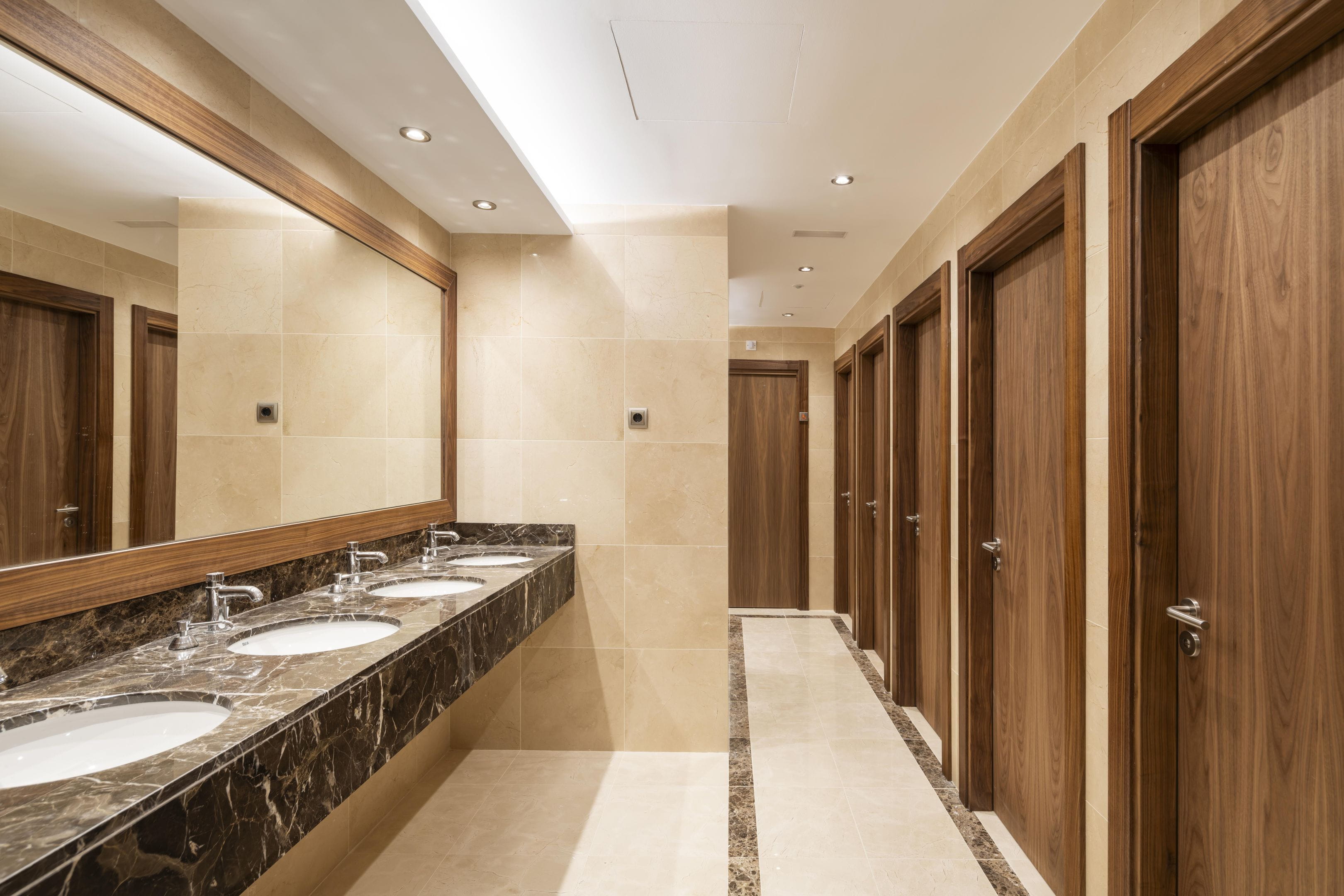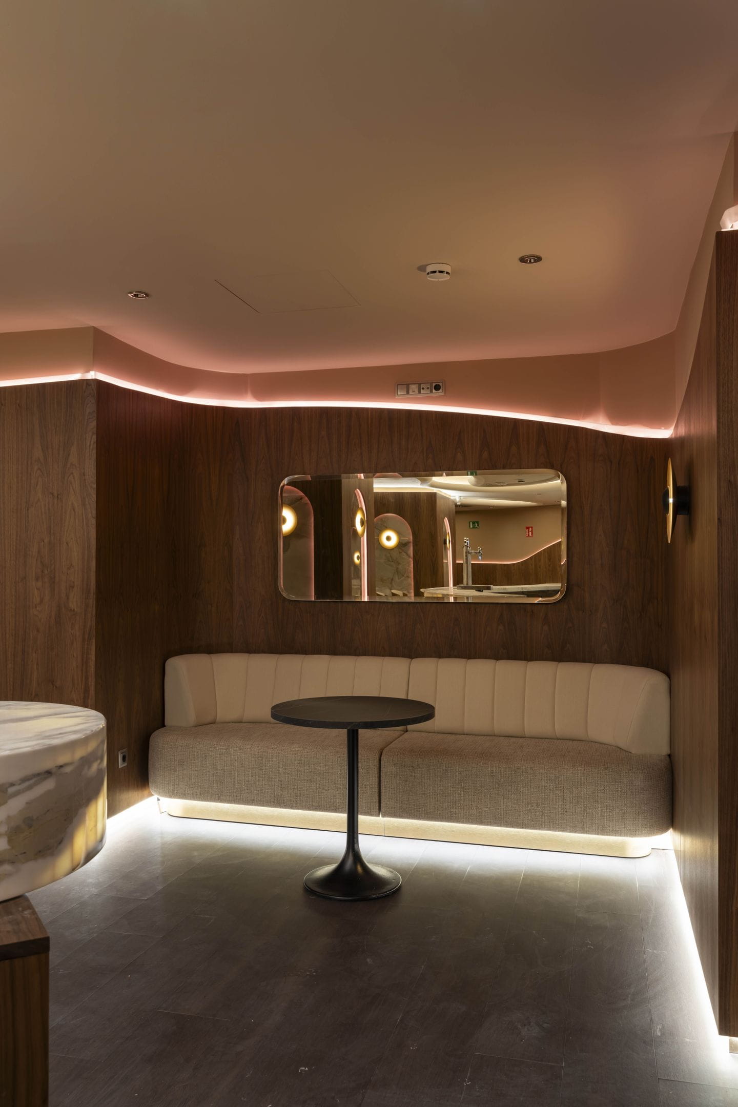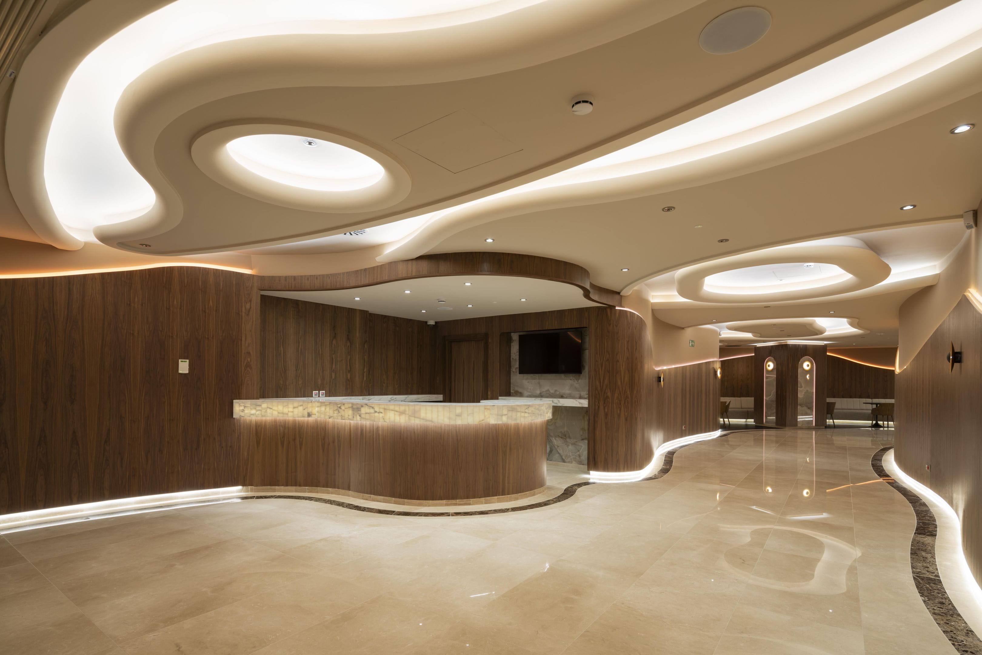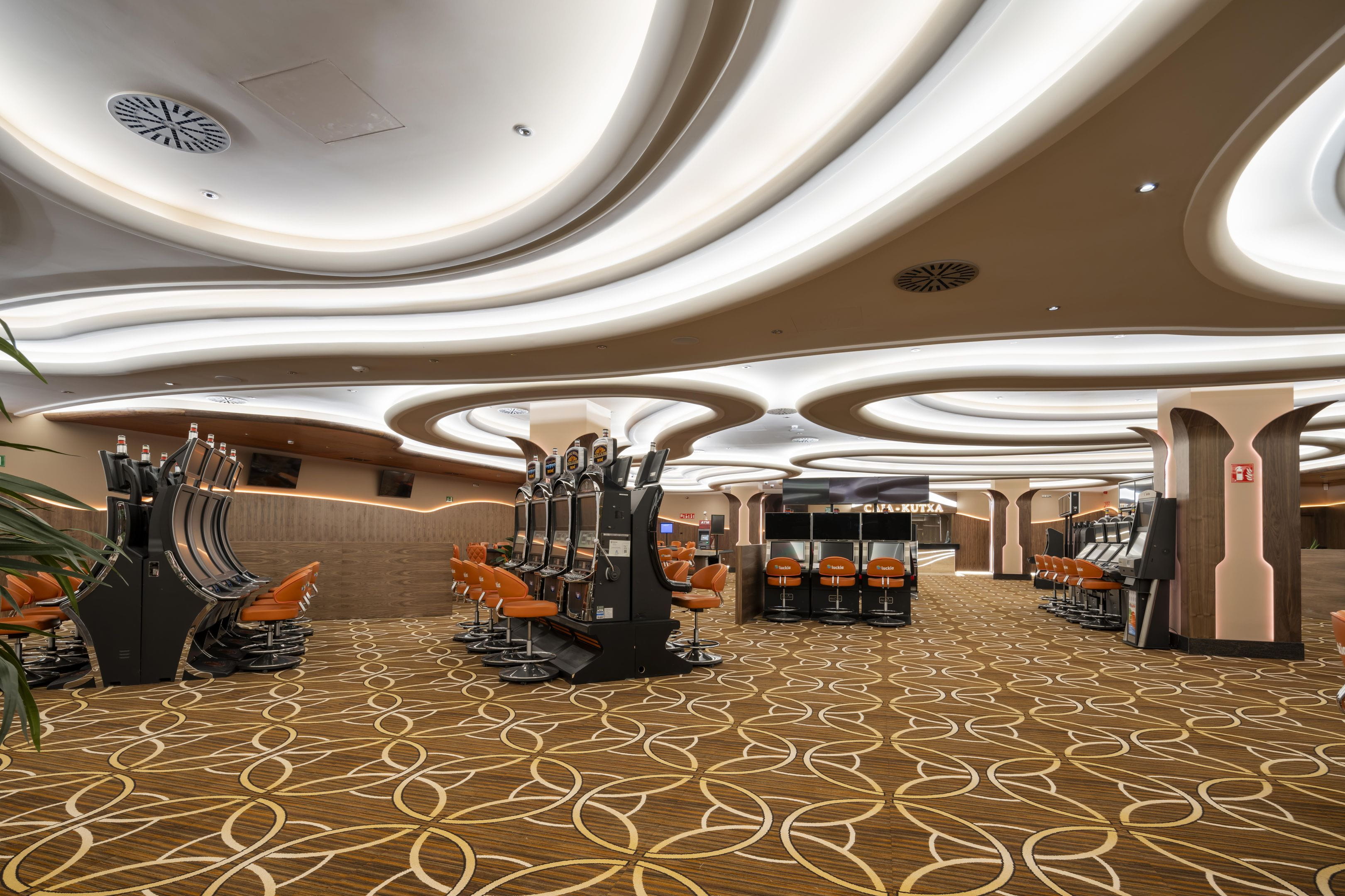 With more than 2,000 m2, this new venue, which has a basement, mezzanine and ground floor that houses its entire gaming offering, features contemporary and exclusive interior design. Among its unique finishes, the wall coverings stand out, with authentic walnut panelling; the countertops in the bar and reception areas, made from the famous polished Italian Calacatta marble to adopt its curved shape; as well as the original kidney-shaped mouldings that surround the light fixtures and turn them into unique decorative elements.