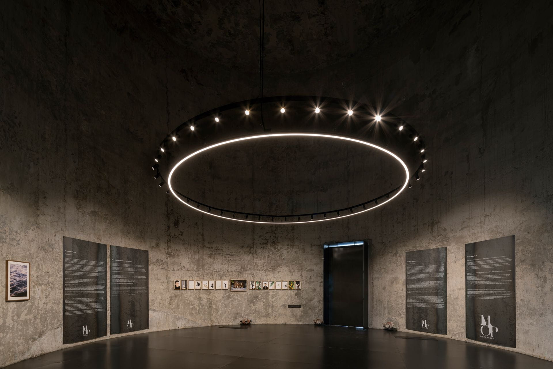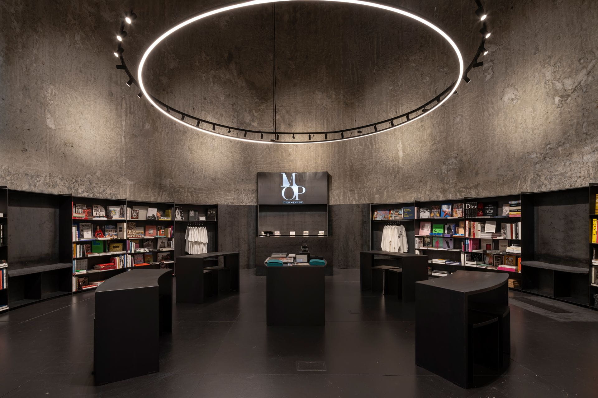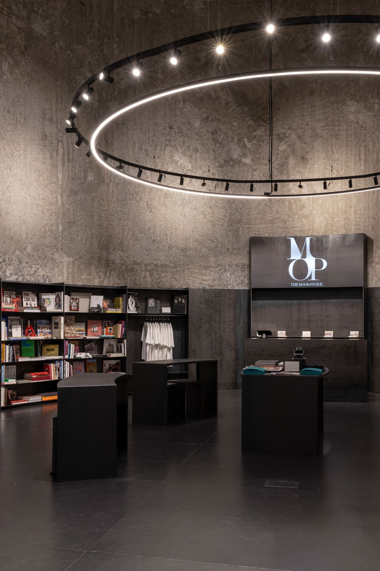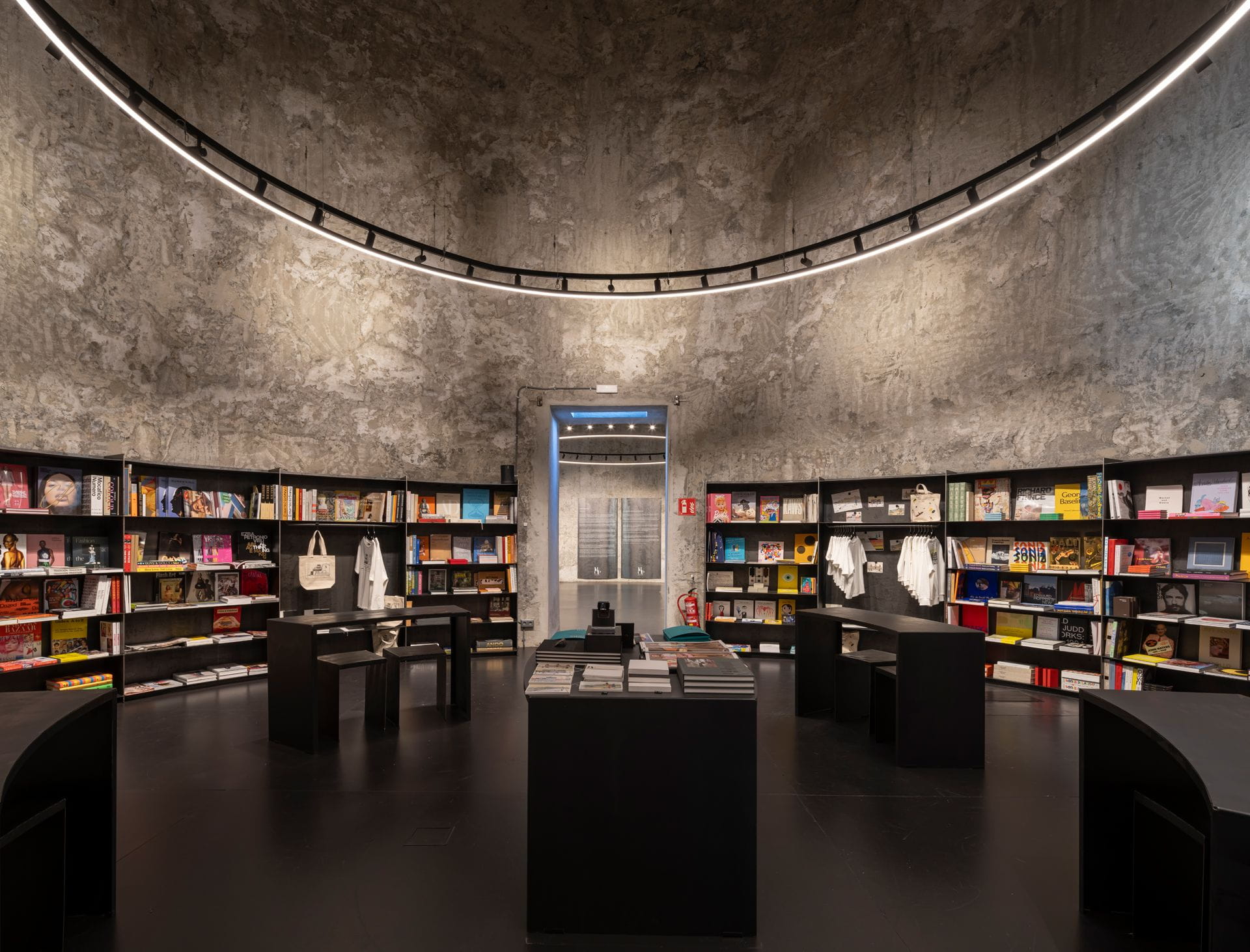 The exhibition is complemented by The Book Store, a large bookshop specialising in photography, fashion, design and other artistic disciplines. This space, dominated by dark tones that highlight the colourful books, is made up of a curved modular metal structure that respects the original shape of the silo in which it is located. Its construction and prototyping required a meticulous selection of materials at source.