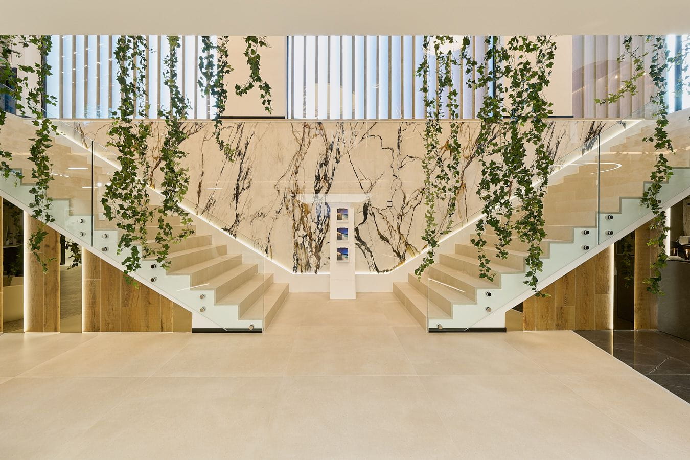 With a total surface area of over 1,400 m² and located in the heart of the city, this new space has an indoor exhibition area of 900 m² and an outdoor terrace of 550 m², showcasing a wide range of construction and decorative solutions offered by Porcelanosa Group materials.