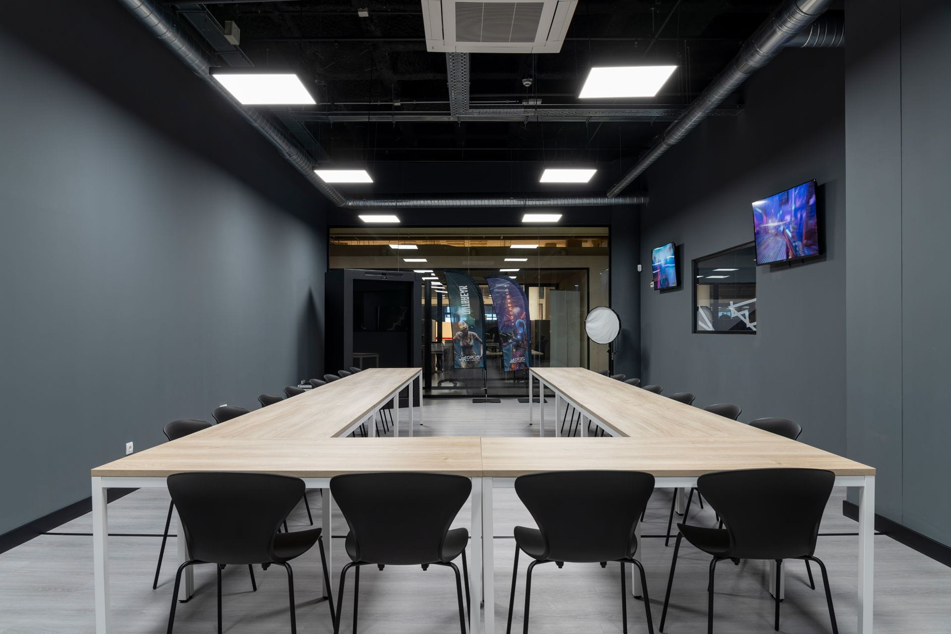 - Suspended lighting systems integrated into the acoustic ceiling.