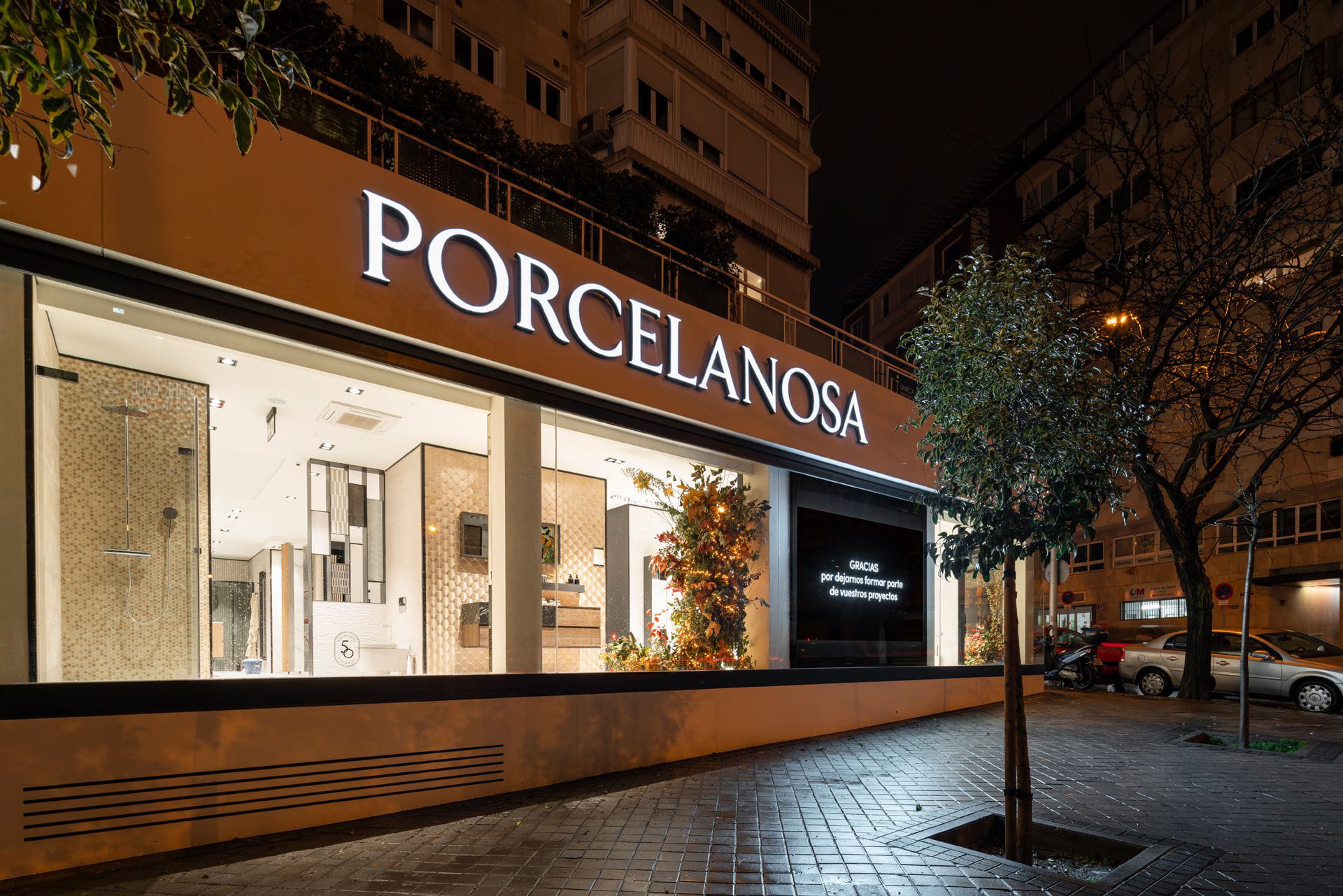 Establecimiento comercial de Porcelanosa ubicado en la avenida Concha Espina, frente al estadio de fútbol Santiago Bernabéu, en la que promete ser una de las principales zonas comerciales de Madrid. Con una superficie de 400 m2, este nuevo showroom está integrado por cuatro zonas diferenciadas: el área técnica-ceramoteca, la zona de aguas, la terraza y trece ambientes que recrean espacios como el salón, el baño o la cocina con materiales de la firma.