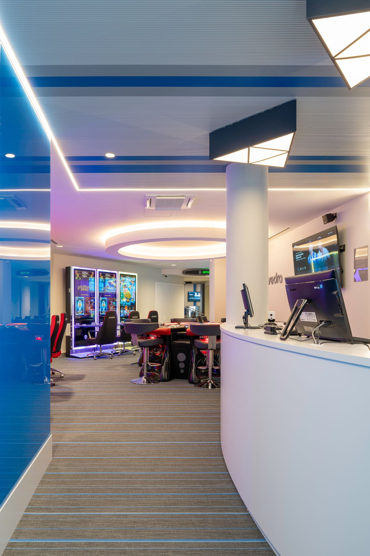 INCOGA a réalisé la rénovation complète du Bingo Pontevedra, un nouvel espace d'environ 500 m2, situé dans un emplacement stratégique de la ville galicienne, entre le centre historique et l'axe commercial. En collaboration avec MMO Arquitectos et le cabinet d'ingénierie Conforma, les locaux préexistants ont été entièrement transformés pour leur nouvelle fonctionnalité, leur conférant une esthétique moderne, lumineuse et attrayante qui optimise l'expérience tant des visiteurs que de l'équipe d'exploitation.
