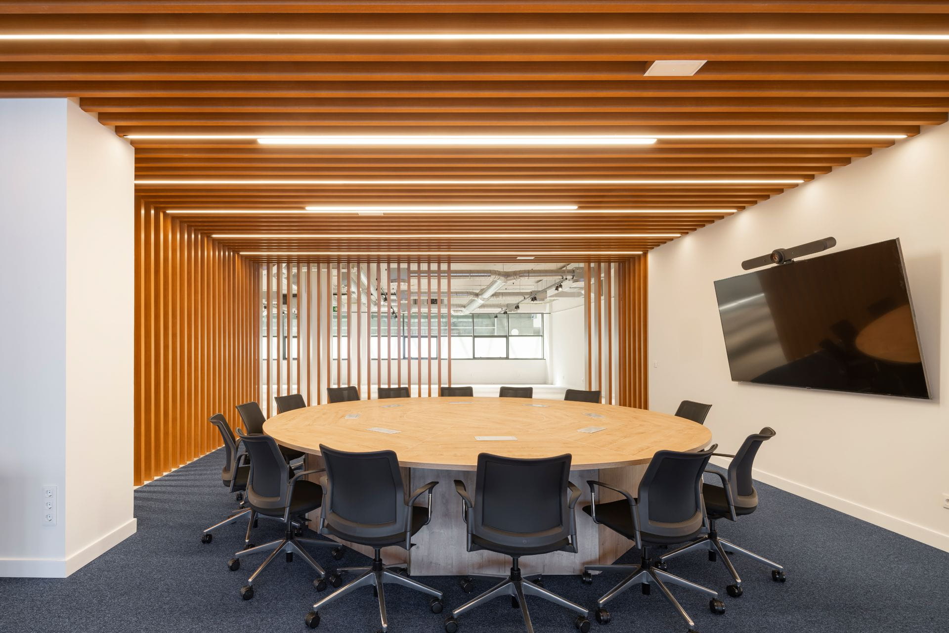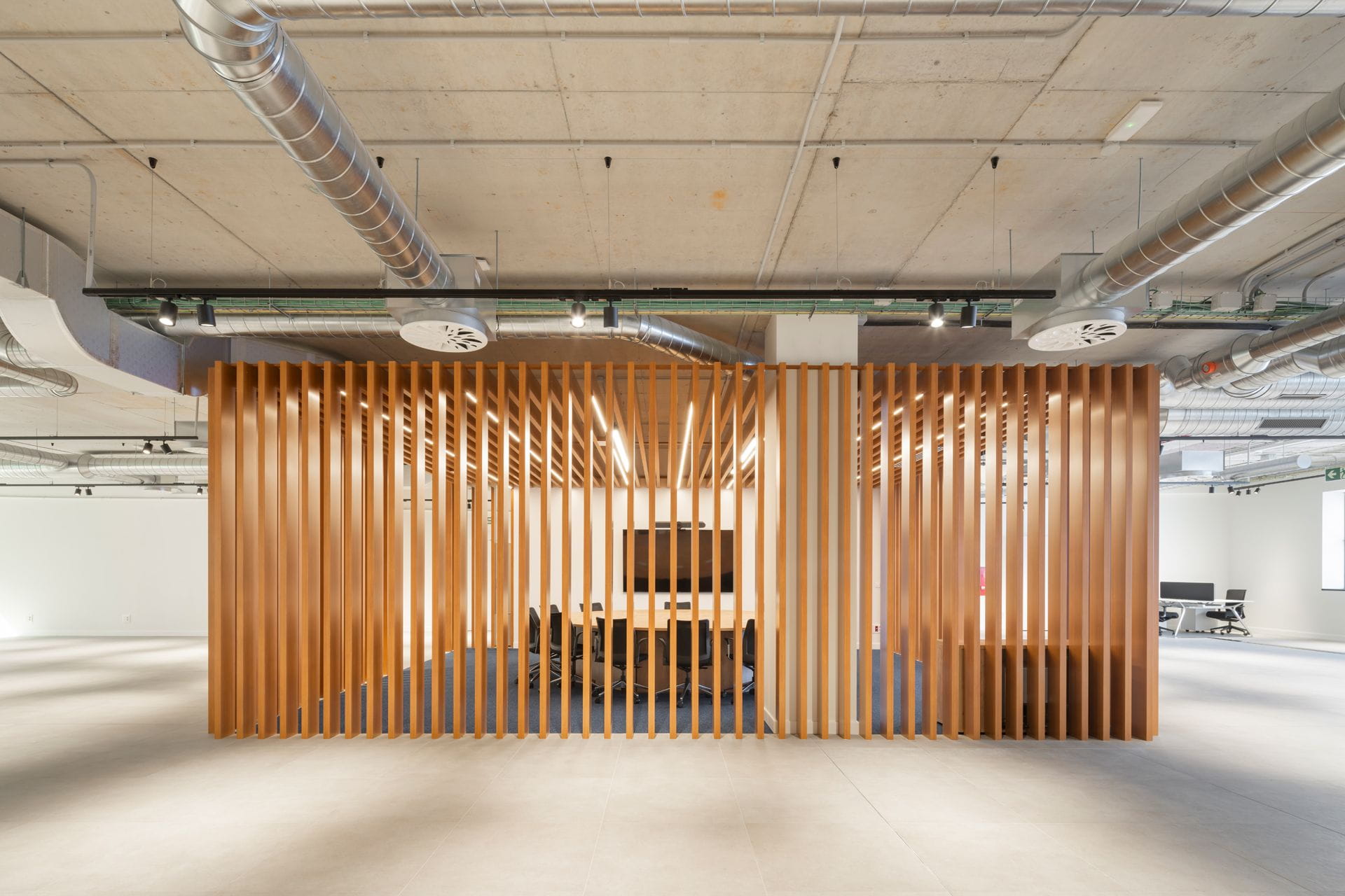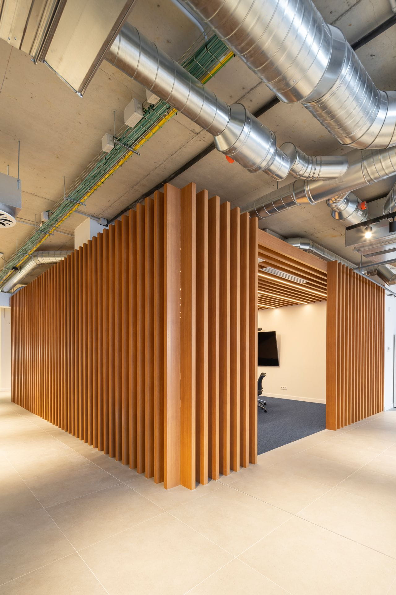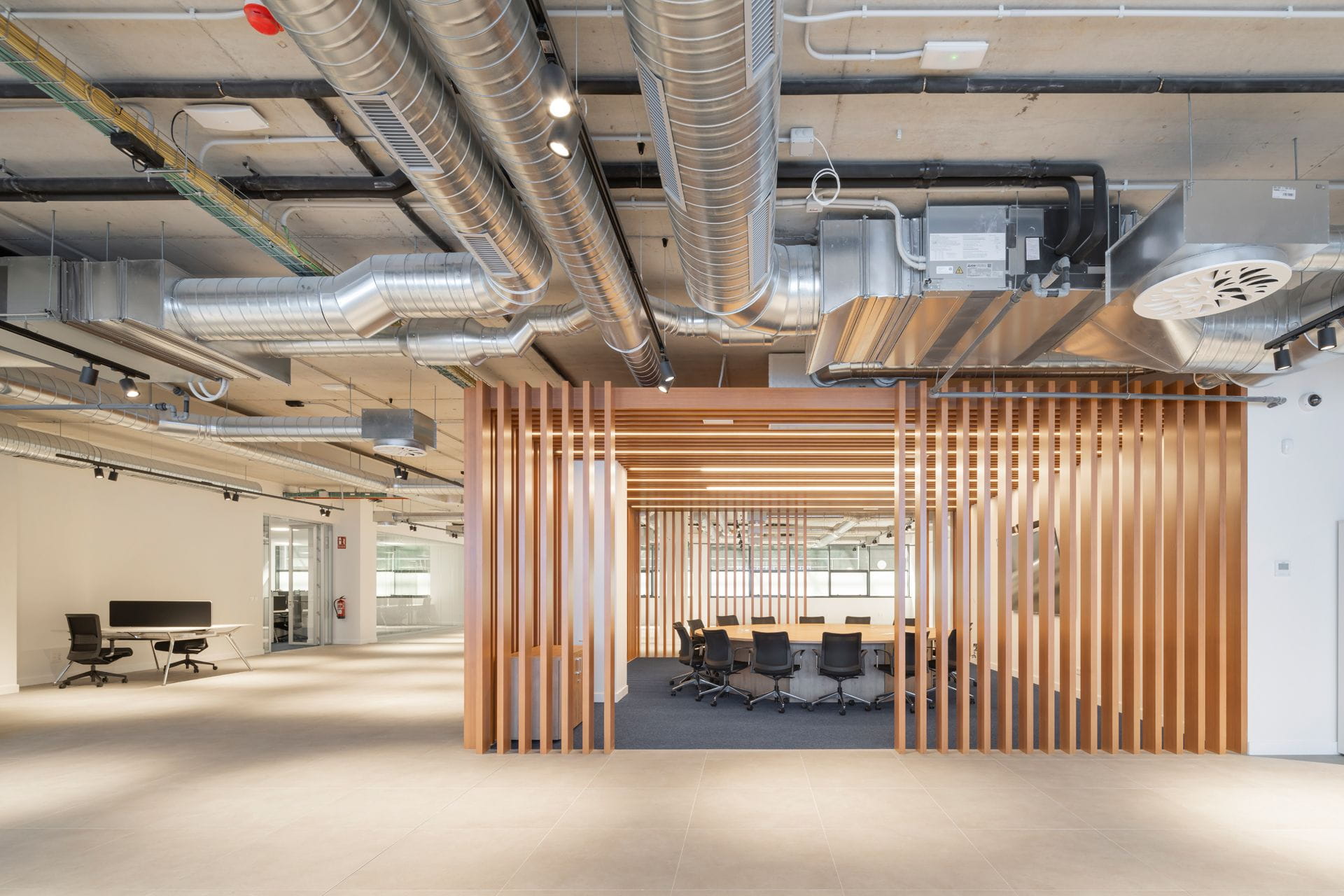 - Dans la zone destinée au showroom, la dalle et les installations apparentes ont été conservées. Dans sa partie centrale, une structure singulière, destinée à servir de salle de réunion, se distingue par un revêtement en profilés cylindriques en aluminium, avec une finition imitation bois de chêne pour apporter de la chaleur.