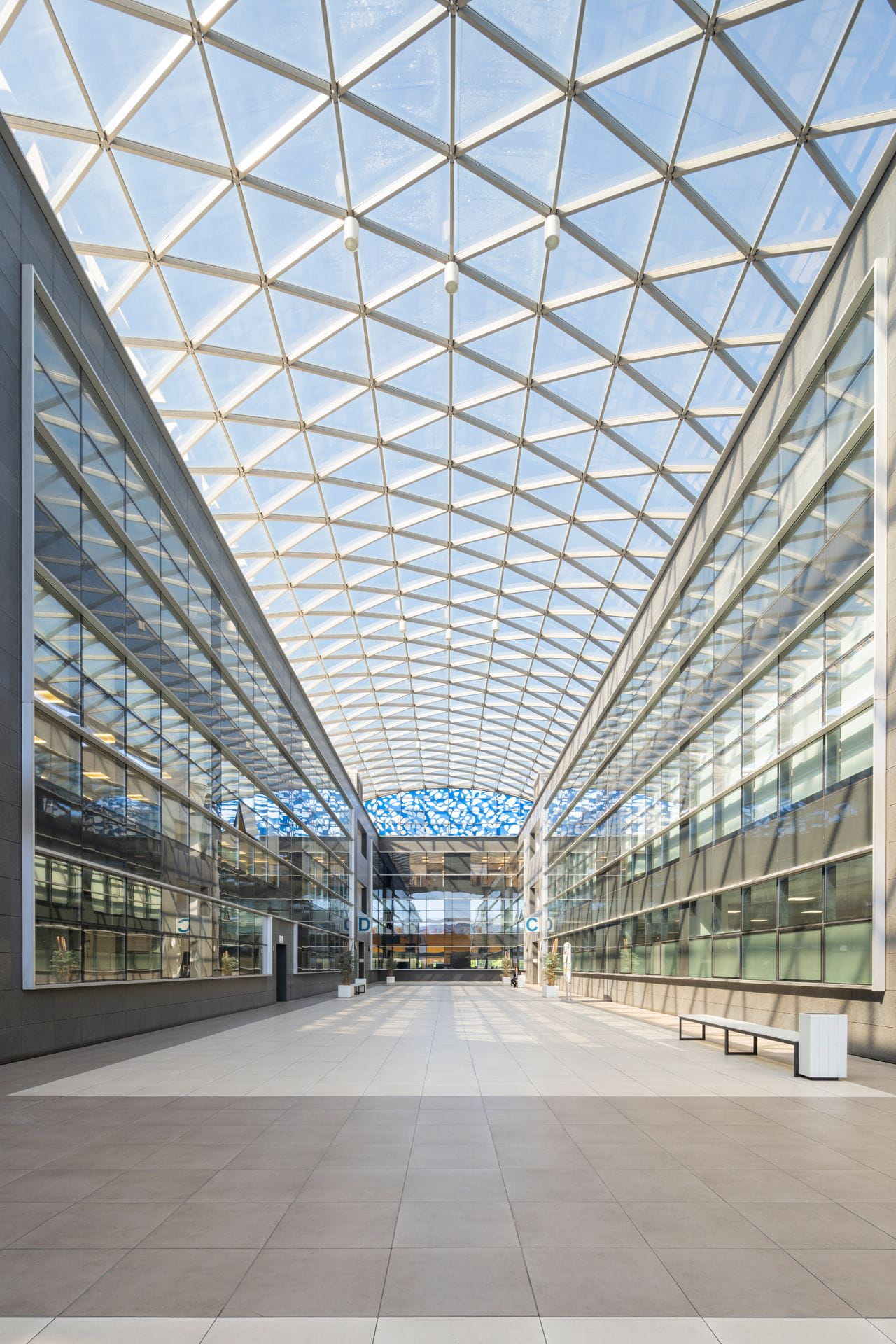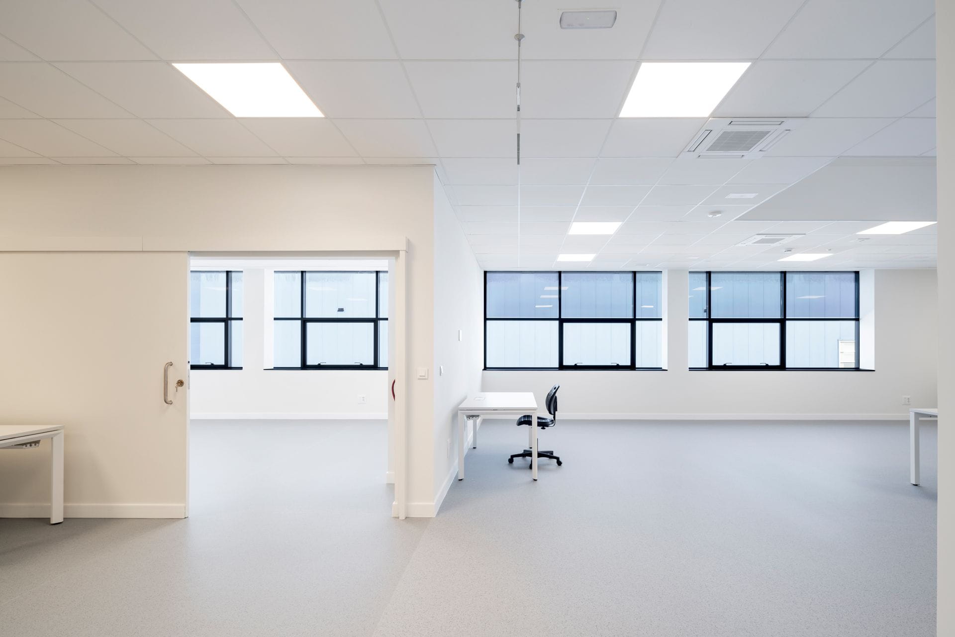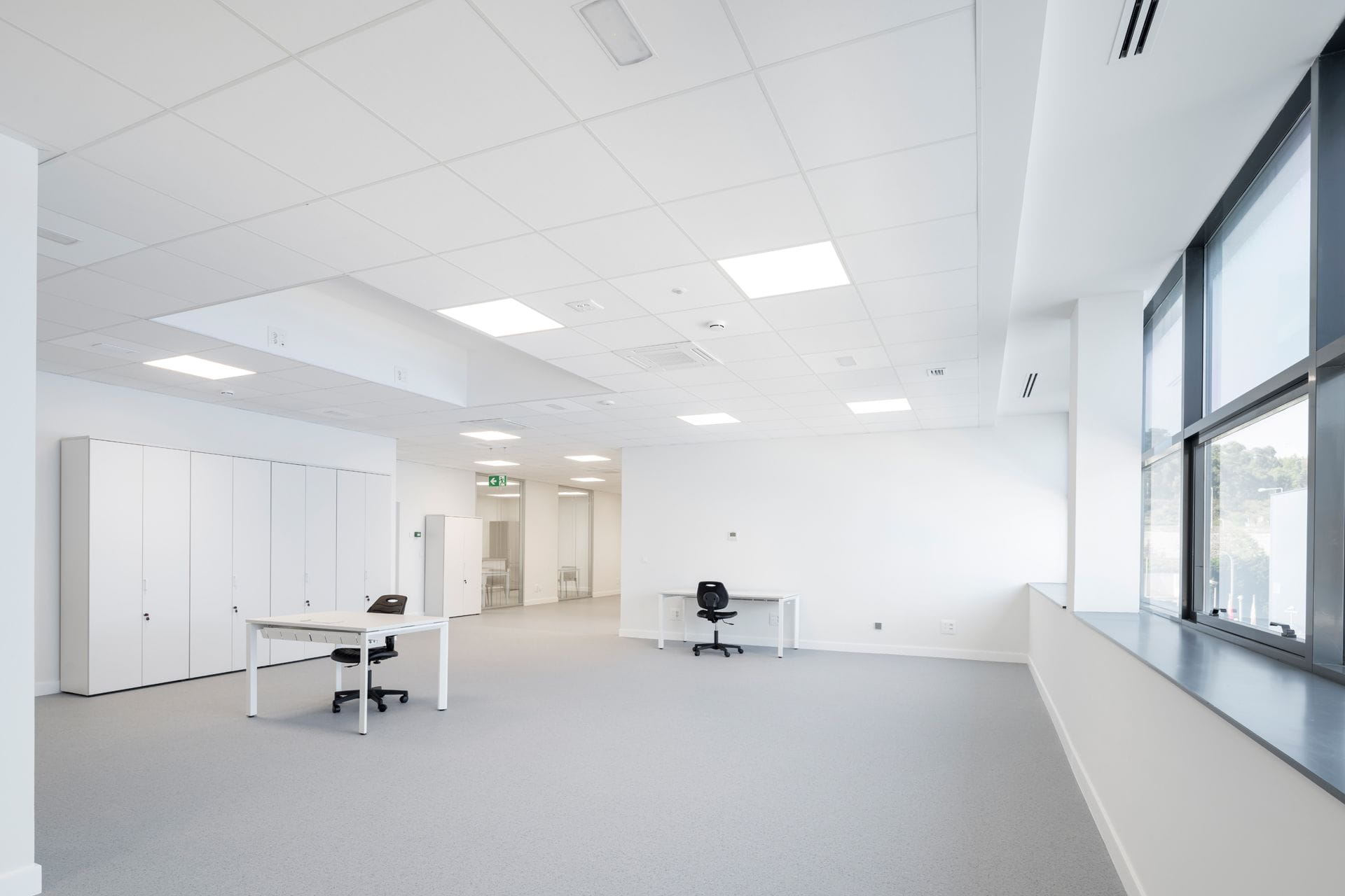 - Mise en œuvre de différentes solutions de revêtements de sol choisies en fonction de l'utilisation de chaque zone. Dans les bureaux, une moquette technique textile, très résistante au passage, fabriquée à partir de fibres 100 % recyclées, a été installée. Dans le laboratoire, un sol durable en PVC dissipatif qui ne transmet pas les charges statiques et offre d'excellentes propriétés antivirales et antibactériennes.