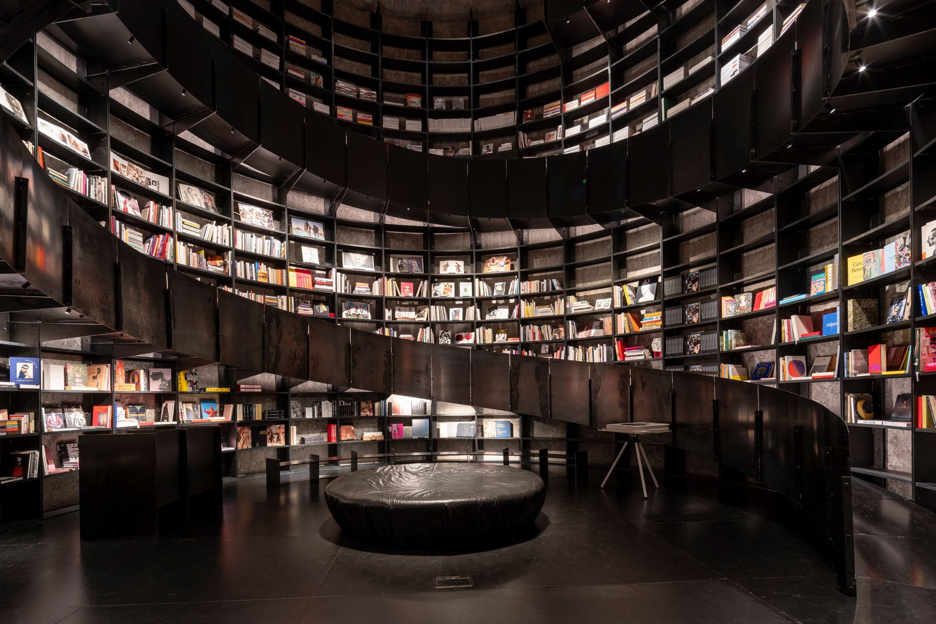 Déjà présente lors de l'exposition précédente, cette exposition est complétée par une spectaculaire librairie spécialisée, avec plus de 5 000 livres dans différentes disciplines, telles que la photographie, l'art, la mode ou l'architecture. Composée d'un ensemble modulaire métallique incurvé et d'un spectaculaire escalier hélicoïdal qui permet de monter dans le silo où elle est située, la librairie a été entièrement conçue et réalisée par INCOGA, à partir d'une sélection minutieuse des matériaux à la source. Il s'agit d'un espace grandiose et original, dominé par des tons sombres qui mettent en valeur les couleurs des livres.