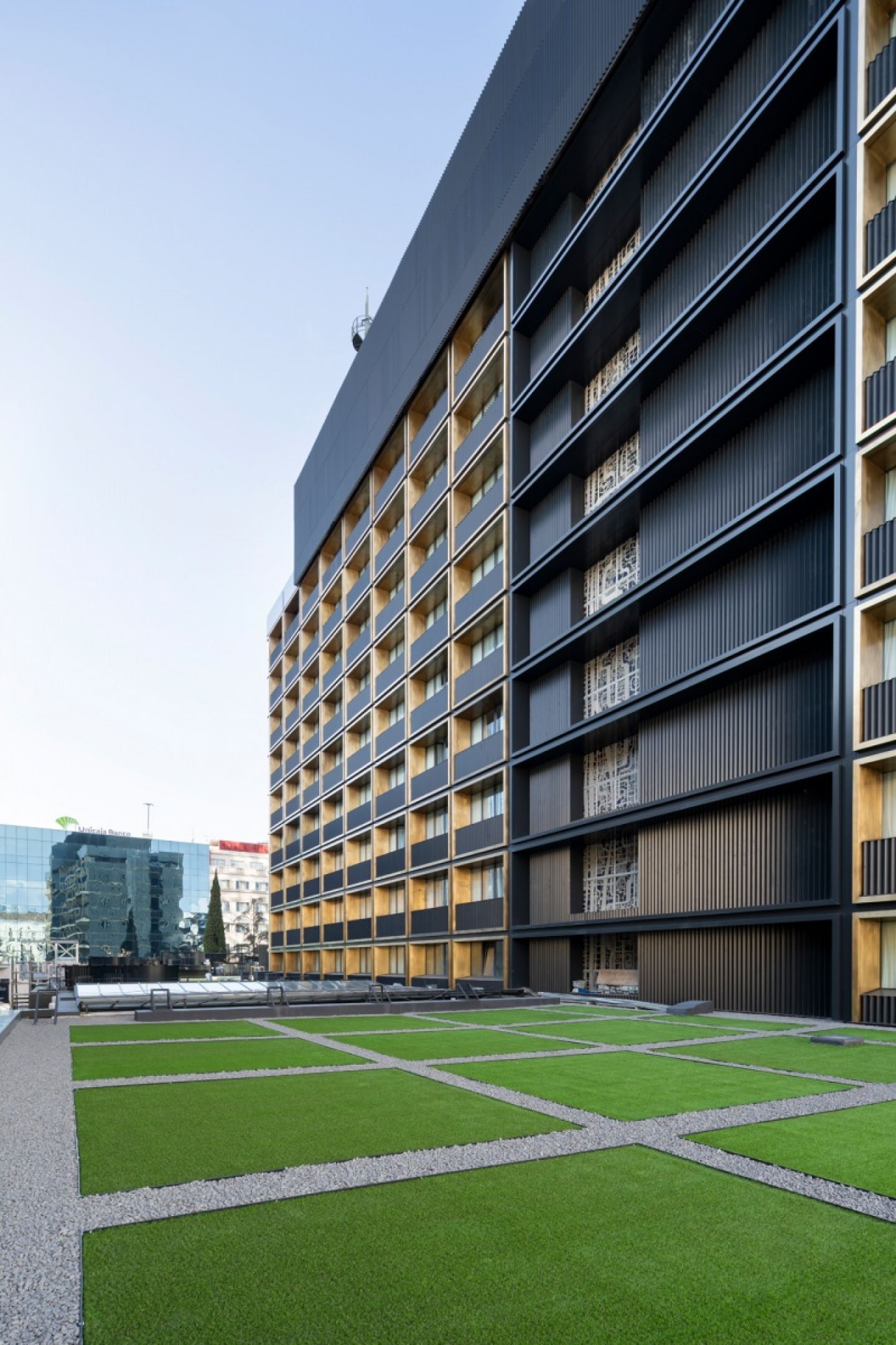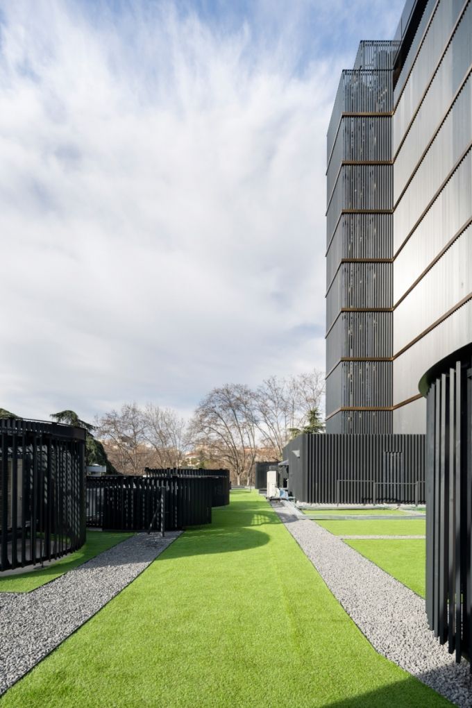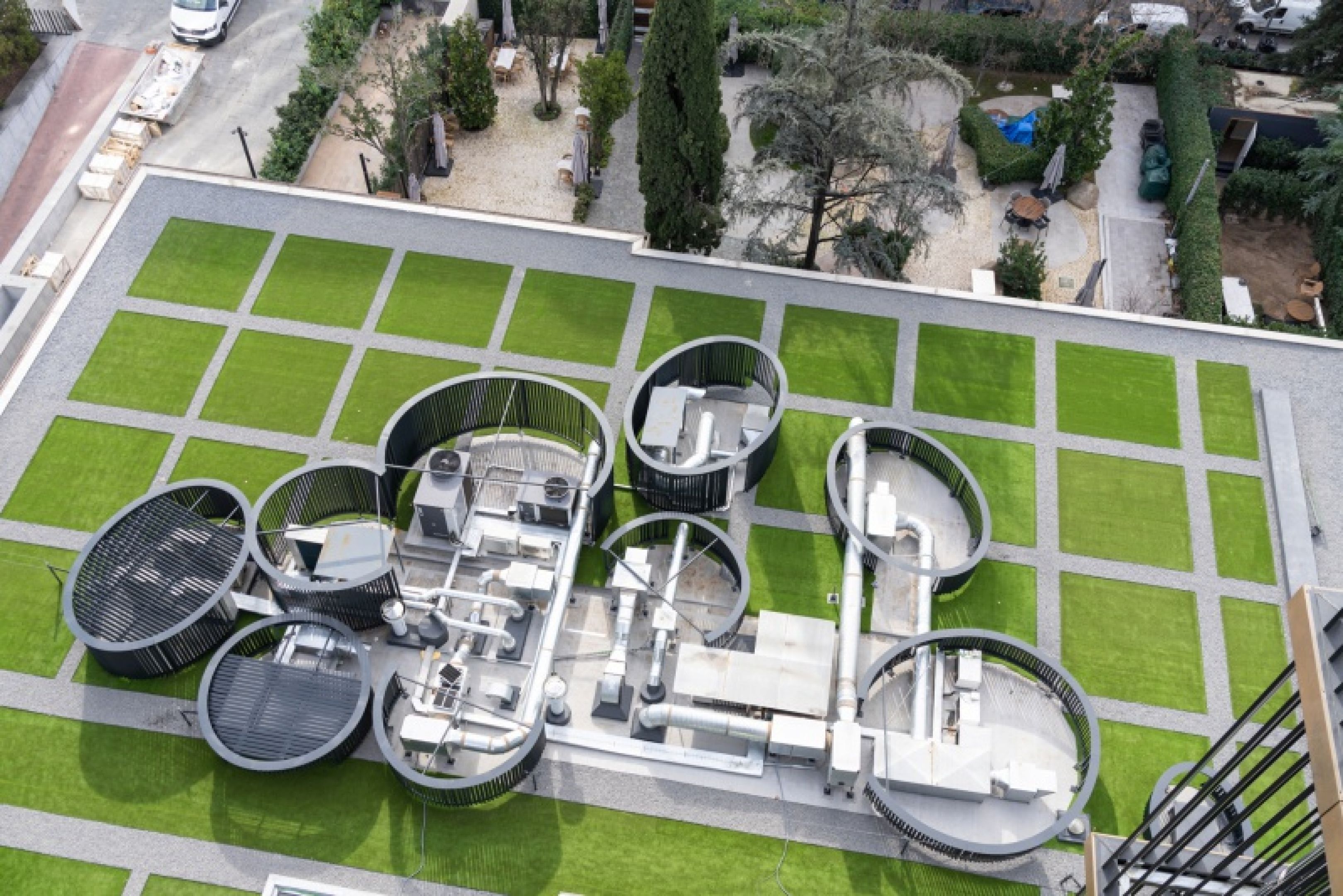 Intervention sur le toit de l’hôtel emblématique Villa Magna à Madrid, situé dans l’un des quartiers les plus exclusifs de la ville. L’objectif du projet était d’humaniser l’espace pour parvenir à une harmonie visuelle avec le reste du bâtiment. Pour cela, nous effectuons l’imperméabilisation et le remodelage ultérieur de toute la surface à travers l’installation de grilles de gazon artificielles, générant différents couloirs en grille avec bord de rocher et treillis métalliques, de lamelles réglables, pour cacher les installations.