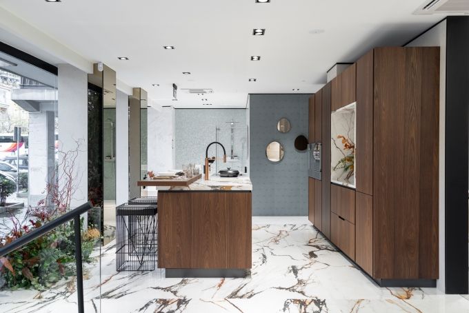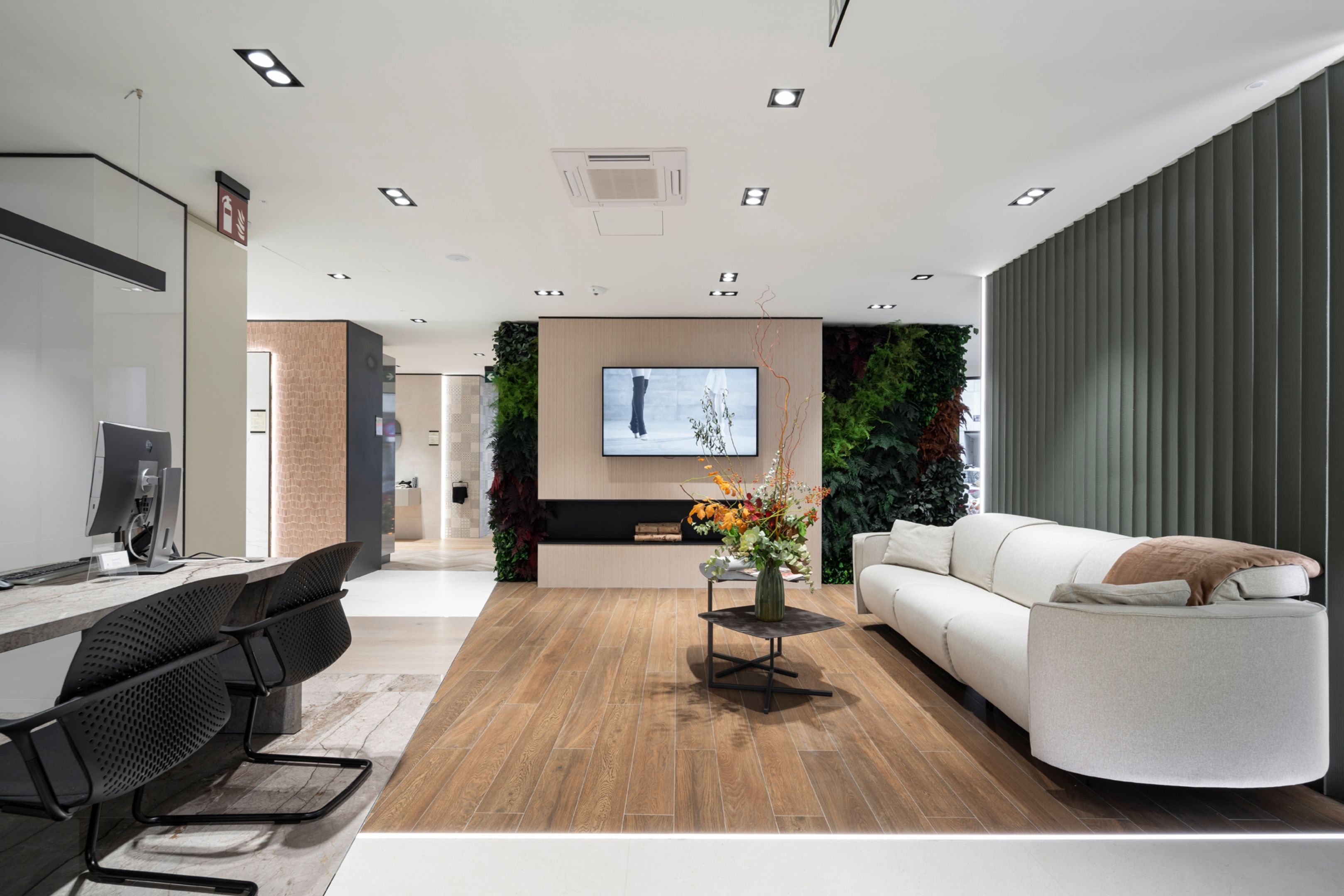 Établissement commercial PORCELANOSA situé sur l’Avenida Concha Espina, en face du stade de football Santiago Bernabéu, dans lequel il promet d’être l’une des principales zones commerciales de Madrid. D’une superficie de 400 m², ce nouveau showroom est composé de quatre zones distinctes : la zone technico-ceramothéque, la zone d’eau, la terrasse et treize environnements qui recréent des espaces tels que le salon, la salle de bain ou la cuisine avec des matériaux de signature.